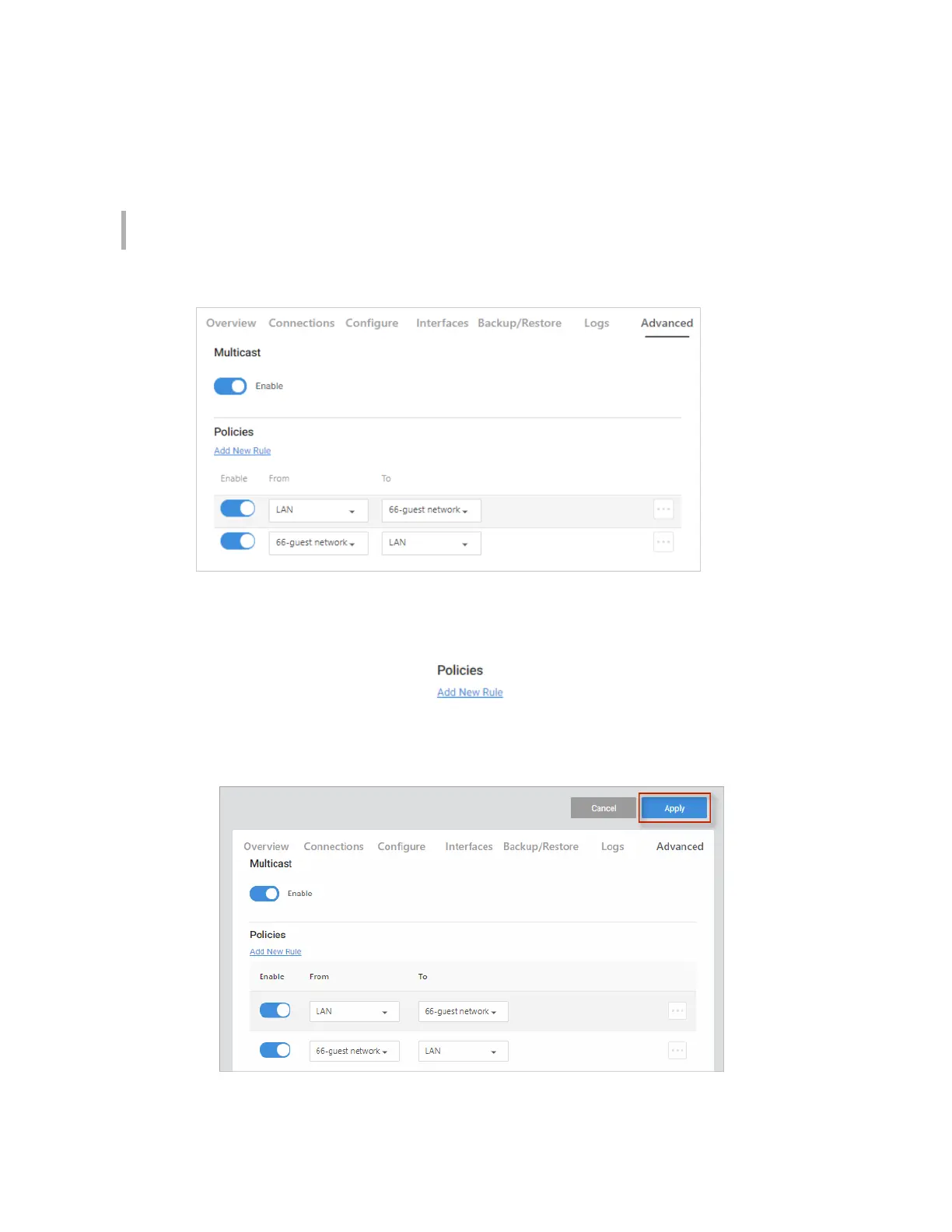 1. Go to the Advanced tab > Multicast Routing. Under Policies, click Add New Rule.