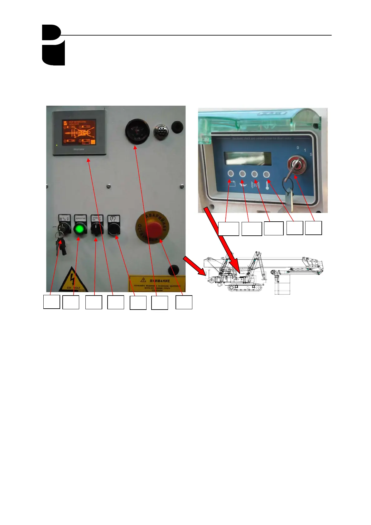 1) Switching controls key. 2) Boom lifting up in travel condition