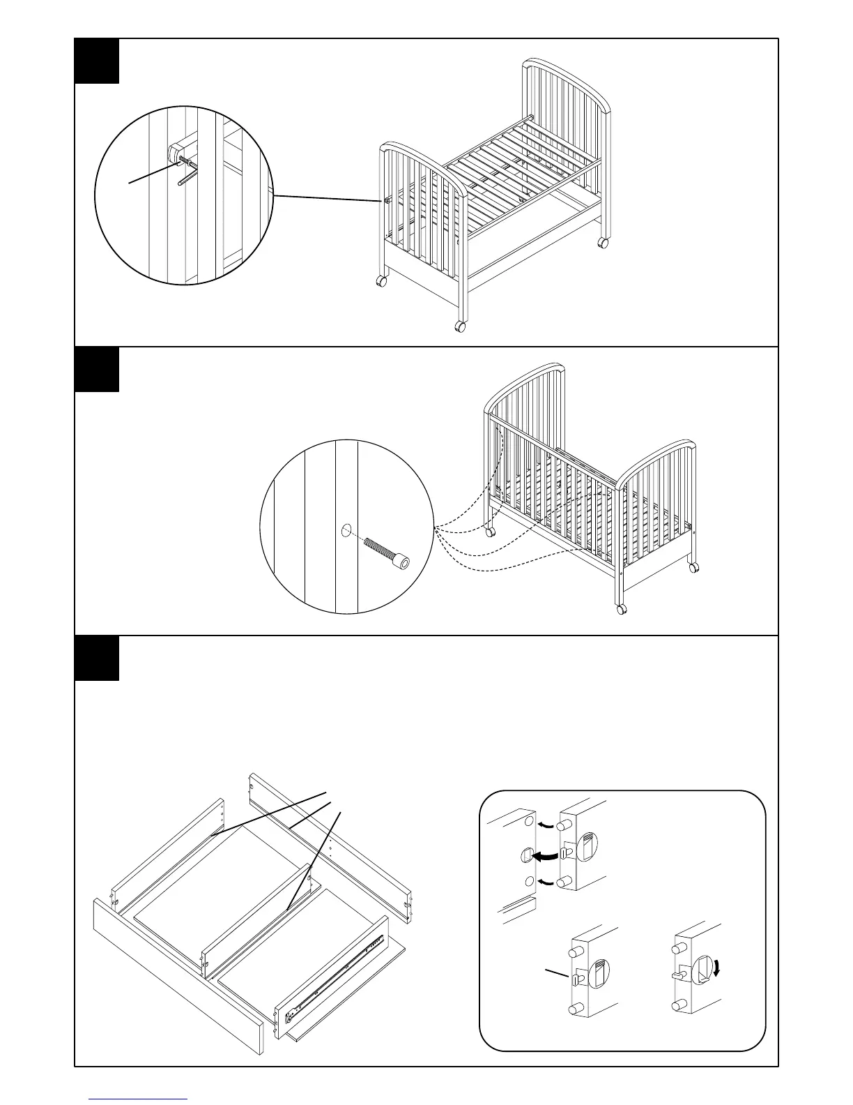 drawer. The wheels drop into the openings in the rail mounted at the inside of the headboard and footboard. Attach the
