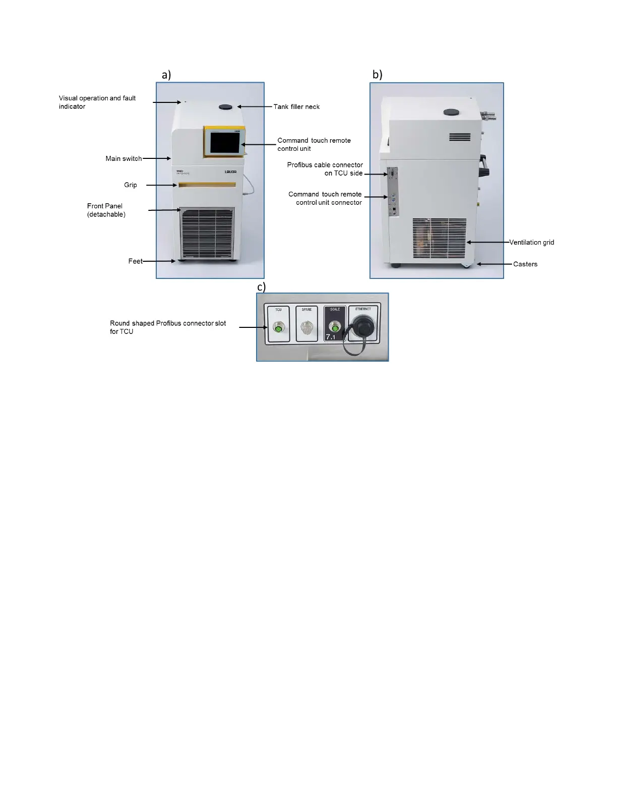 a) Front of TCU, including Interface panel, b) Side of TCU with Interface panel,