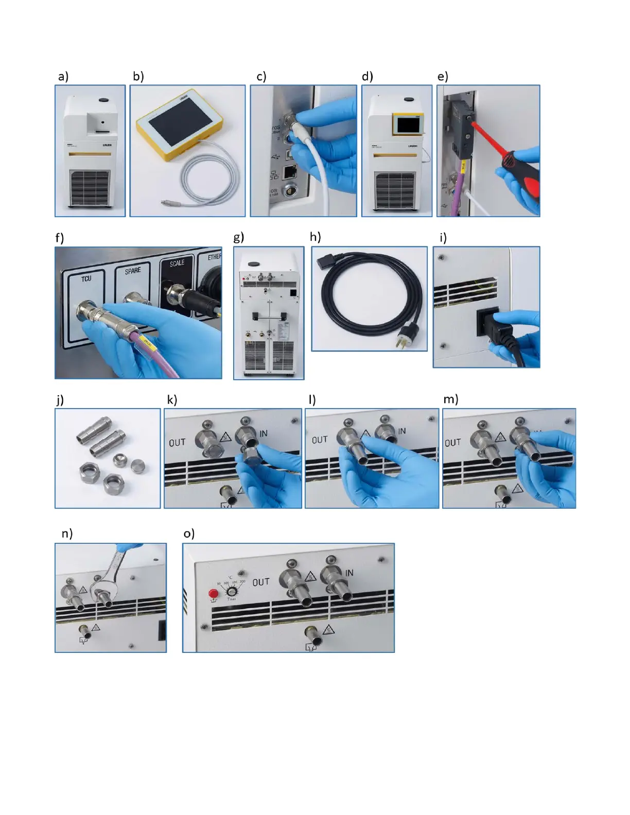 i) Connecting power on rear side of TCU, j) Barbed connectors for IN/OUT line on back of TCU and closure nuts,