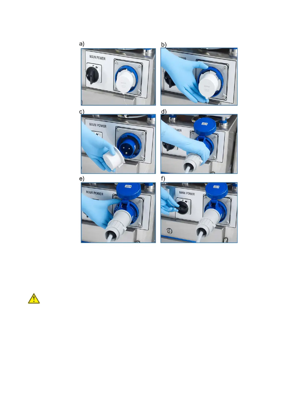 d) Plugging power cable, e) Locking power cable, f) Switching ON the control system.