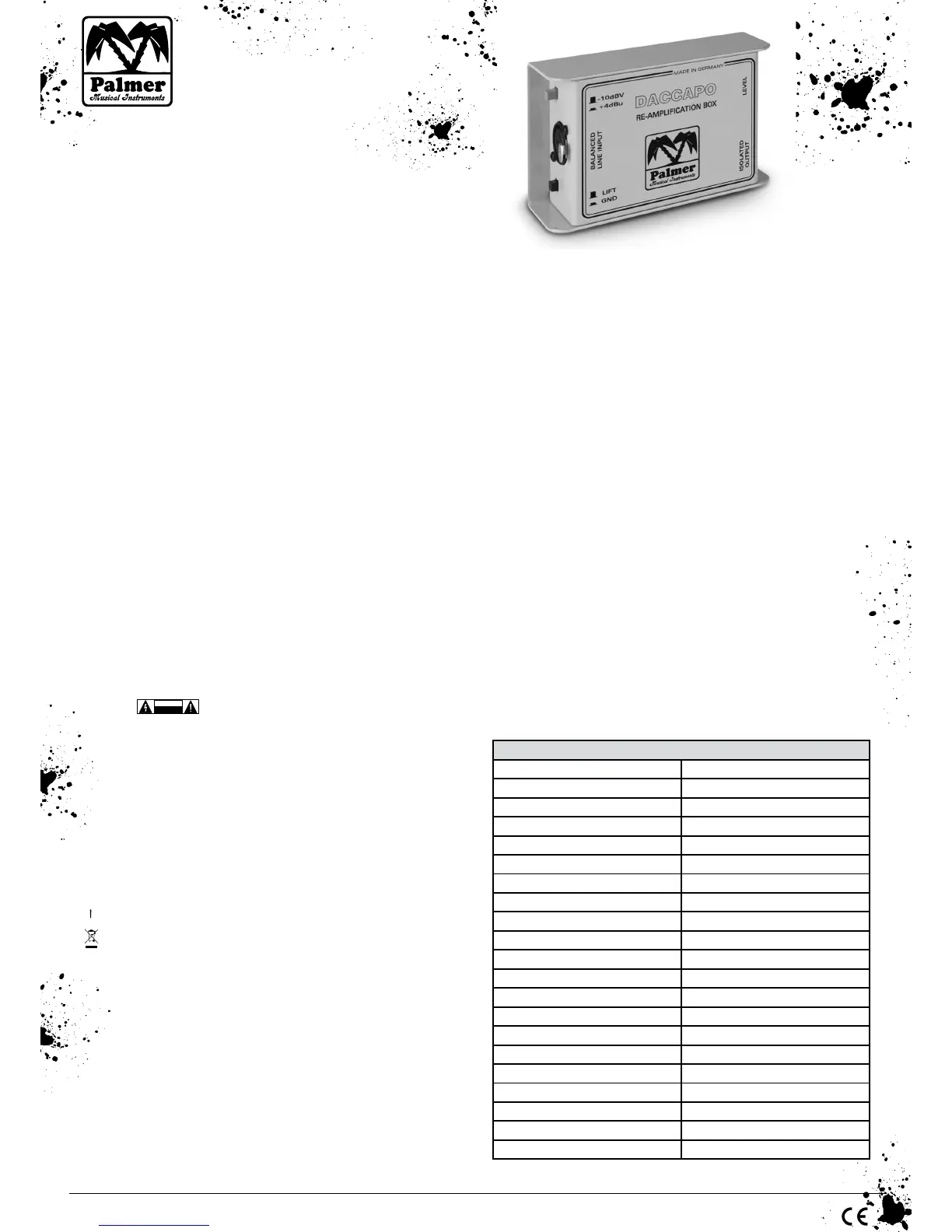 © Palmer Musical Instruments, Adam Hall GmbH, D-61267 Neu-Anspach, Daimlerstr. 9, Germany TEL: ++49 (0)6081 94190