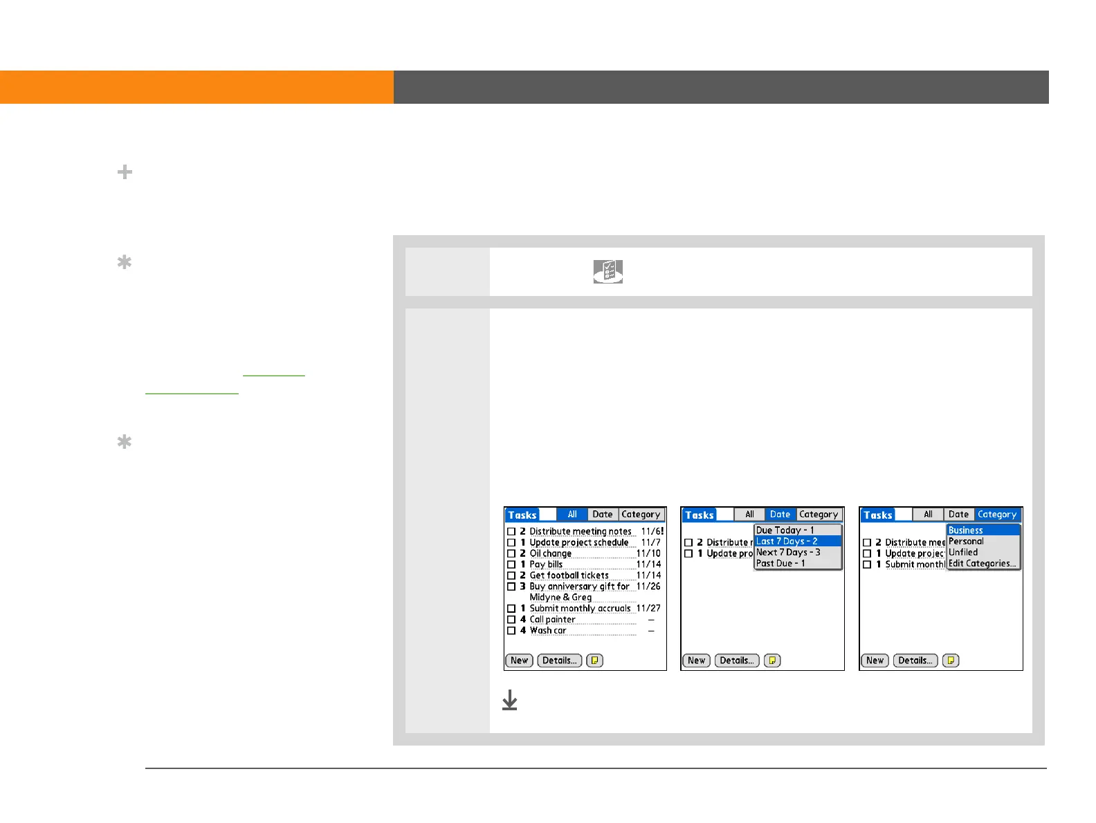 Date Displays tasks that are due in a specific time frame. Tap the pick list in the