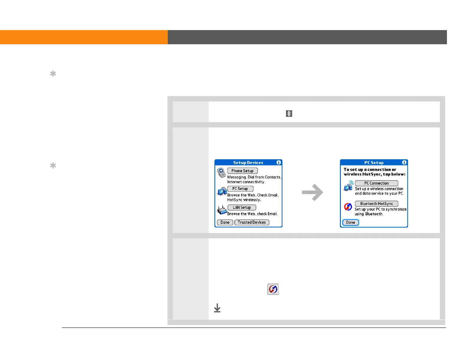 2 Select Setup Devices, select PC Setup, select Bluetooth HotSync, and then