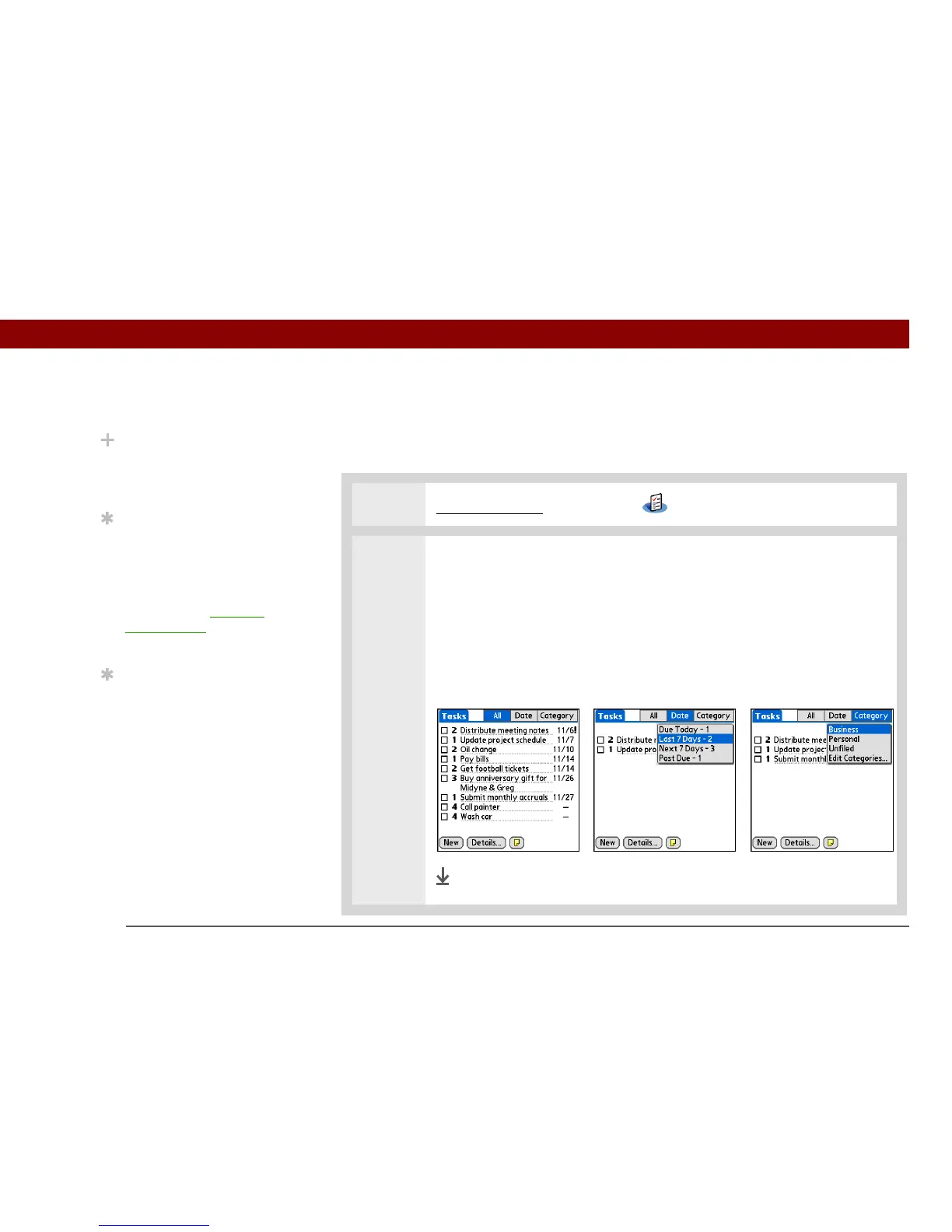 Date Displays tasks that are due in a specific time frame. Tap the pick list in