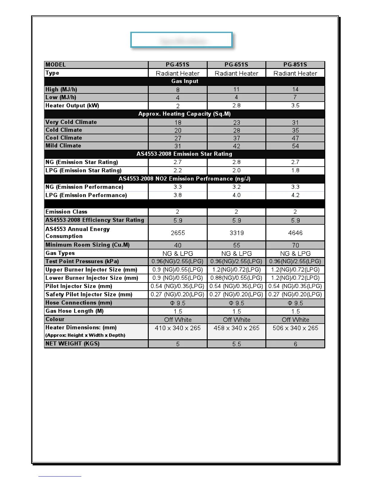 Paloma PG-451S - Specifications