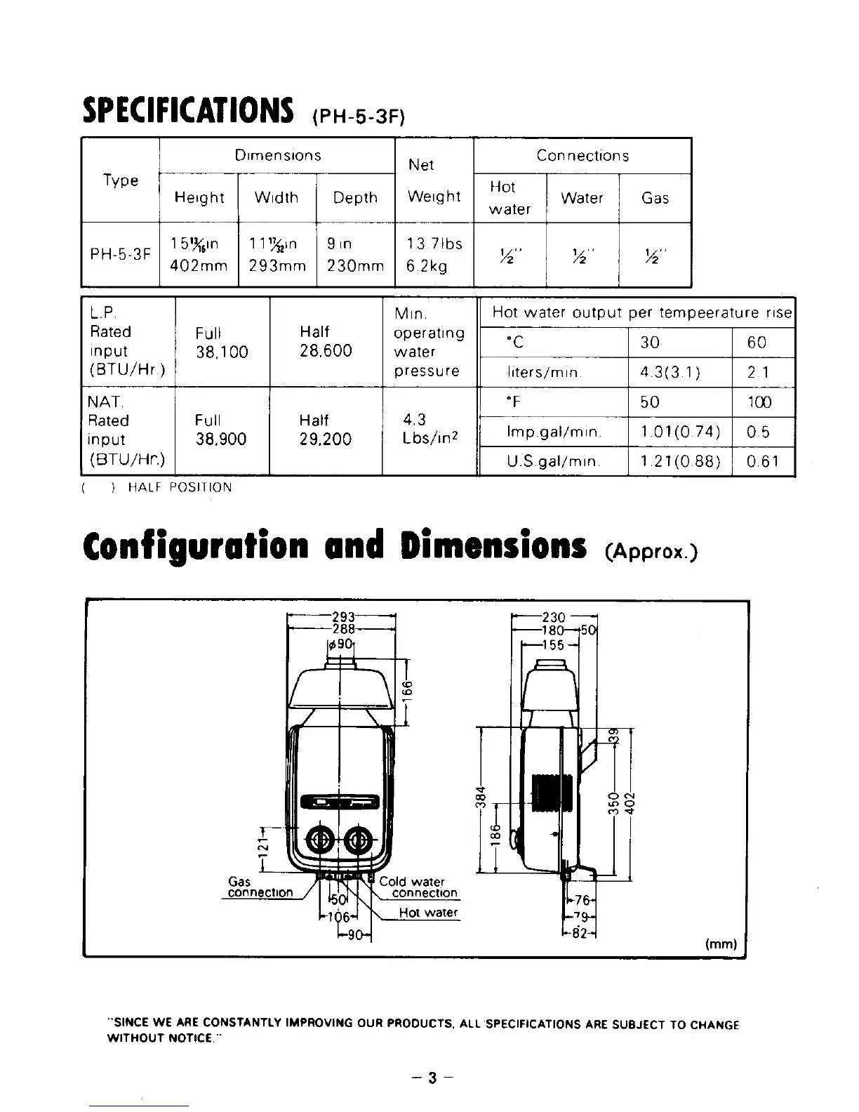 Paloma PH-5-3F - Specifications; Dimensions and Connections; Hot Water Output Specifications; Configuration and Dimensions