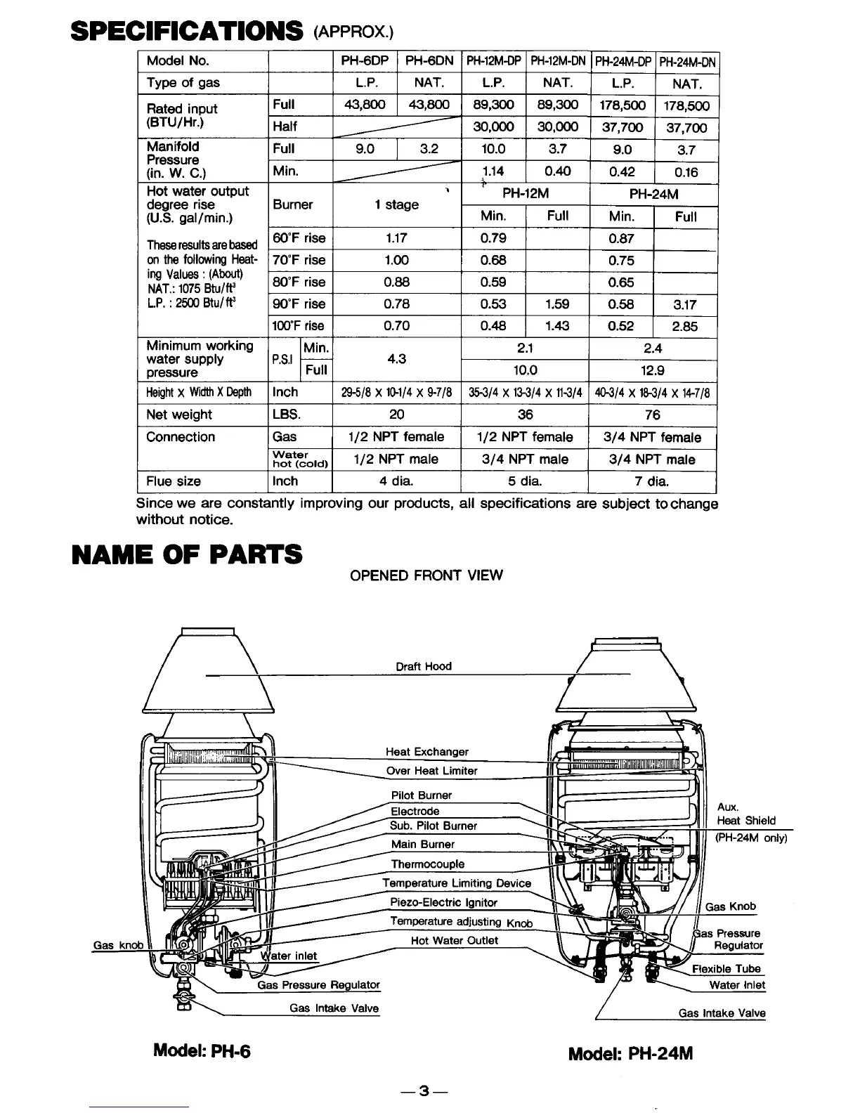 Paloma PH-6DN - Specifications; Name of Parts; Opened Front View