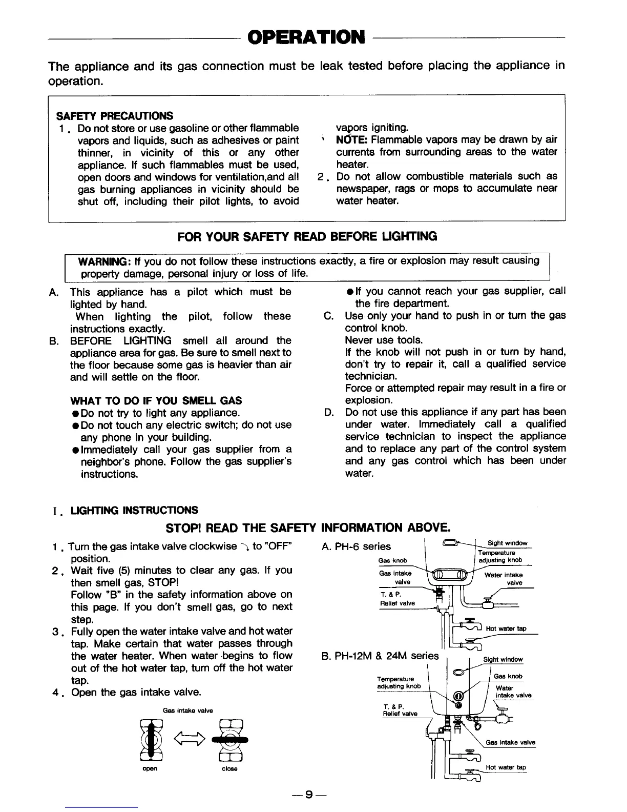 Paloma PH-6DN - Water Heater Operation and Lighting; Pre-Lighting Safety Procedures; Pilot Burner Lighting Instructions