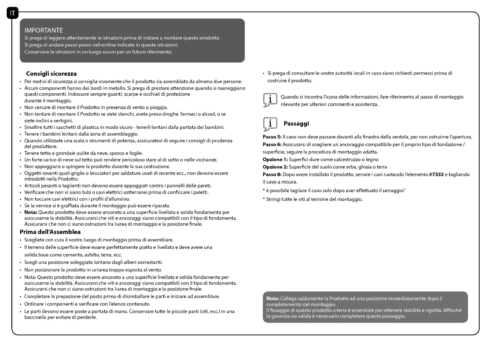 Per motivi di sicurezza si consiglia vivamente che it prodotto sia assemblato da almeno due persone.