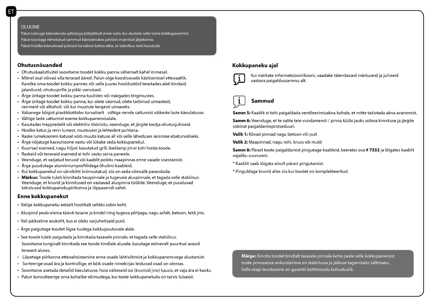Palun tutvuge kaesolevate juhistega pohjalikult enne seda, kui alustate selle toote kokkupanemist.