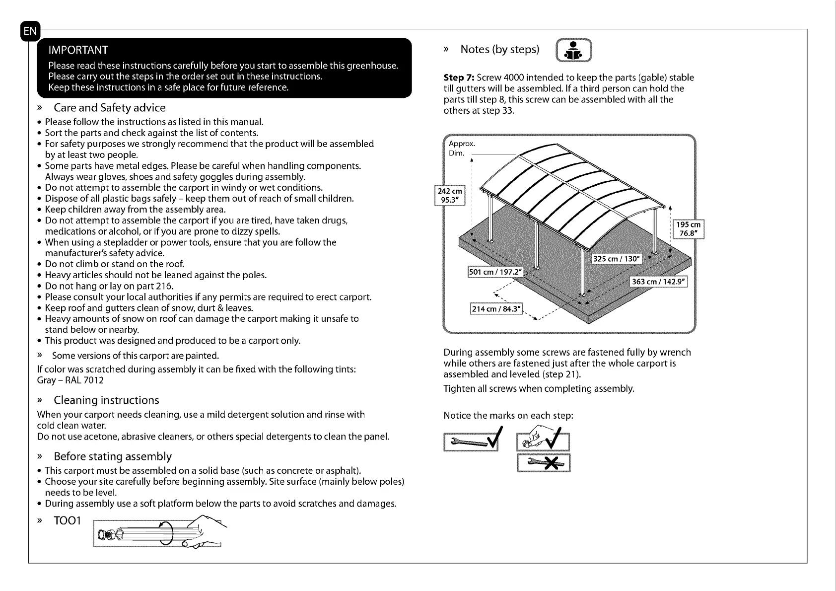 Do not attempt to assemble the carport if you are tired, have taken drugs,