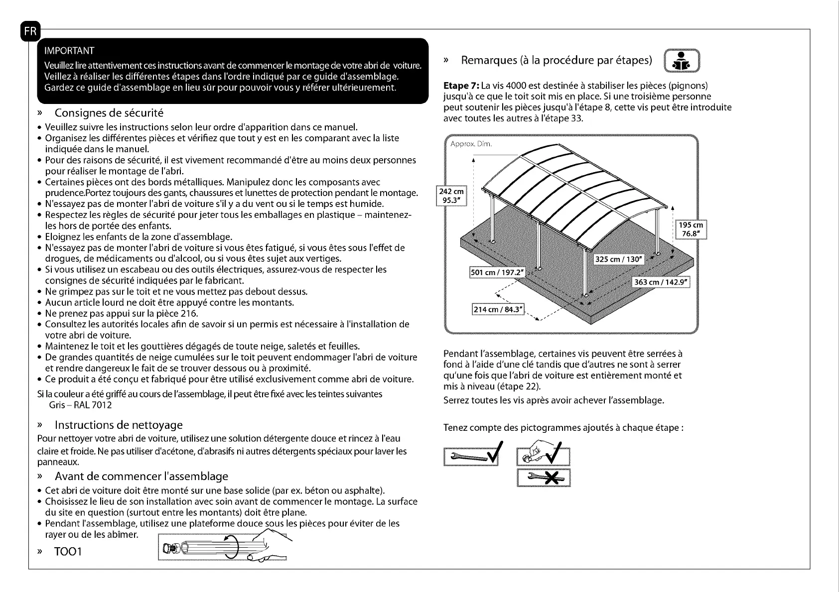 N'essayez pas de monter l'abri de voiture s'il y a du vent ou si le temps est humide.