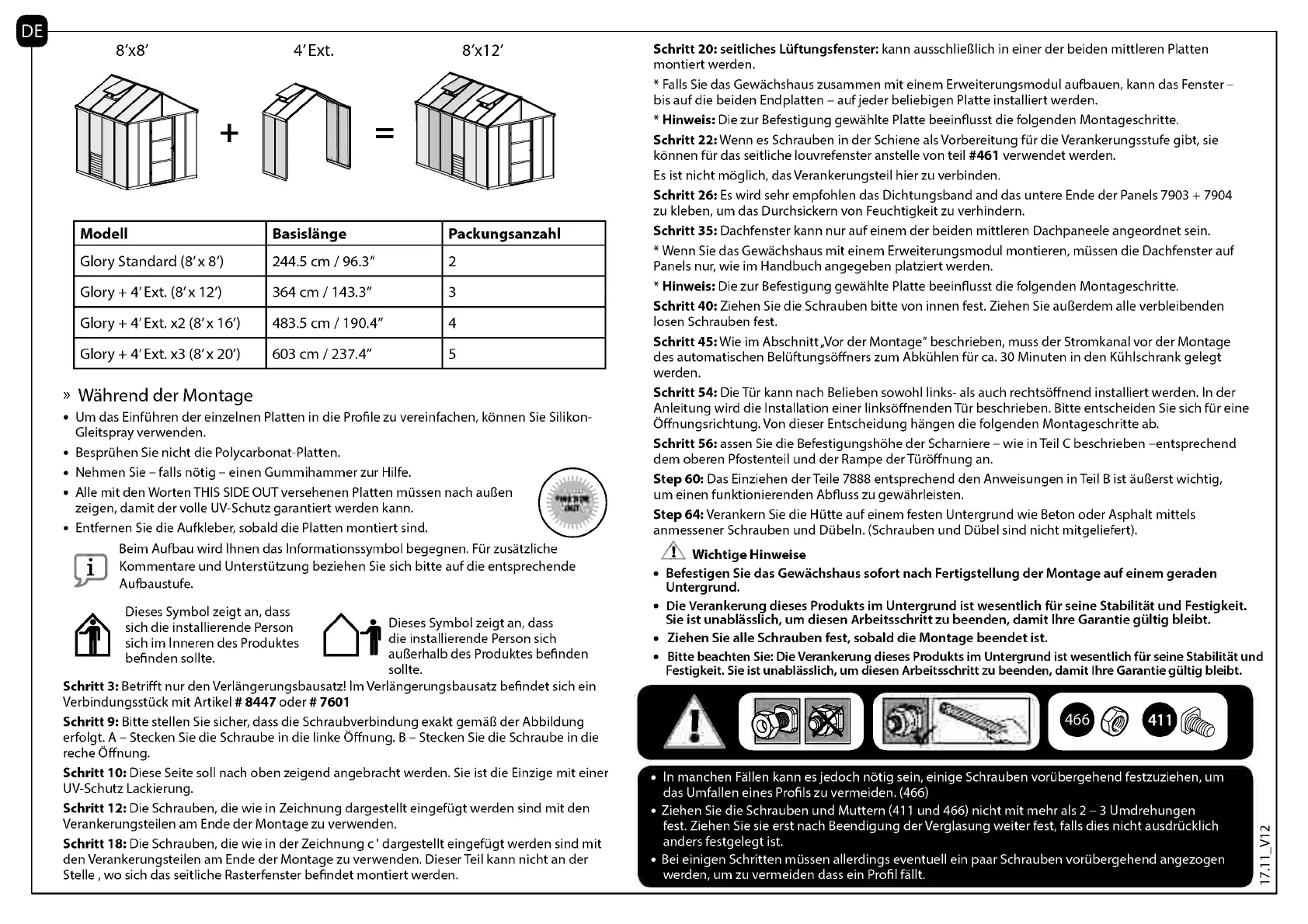 Ziehen Sie die Schrauben und Muttern (411 und 466) nicht mit mehr als 2 -3 Umdrehungen