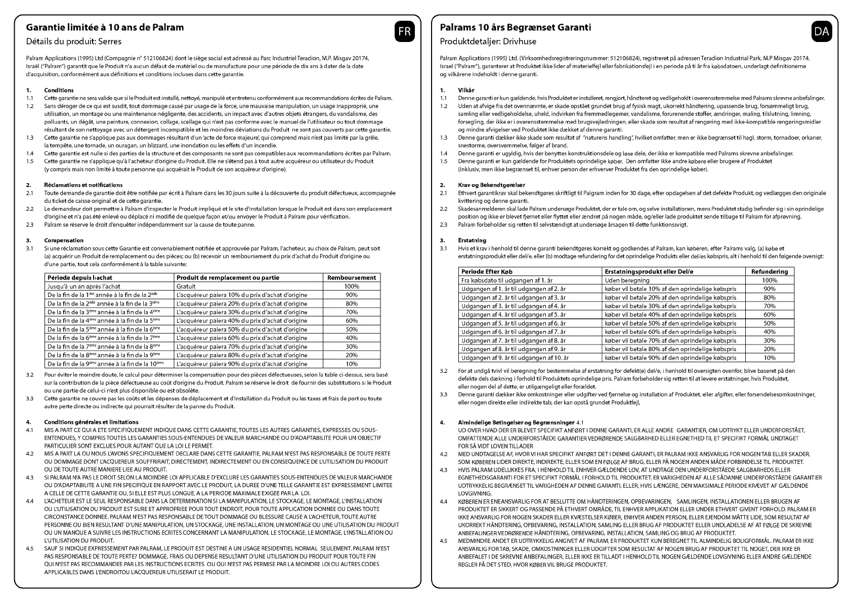 Israel ("Palram") garantit que le Produit n'a aucun defaut de materiel ou de manufacture pour une periode de dix ans a dater de la date