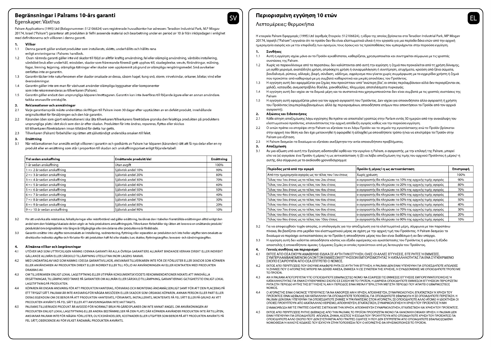 20174, Israel ("Palram") garanterar att produkten ar felfri ayseende material och bearbetning under en period av 10 Sr fran inkopsdagen i enlighet
