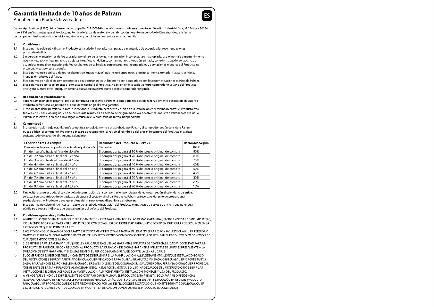 Israel ("Palram") garantiza que el Producto no tendra defectos de material o defabricacion durante un periodo de Diez arios desde la fecha