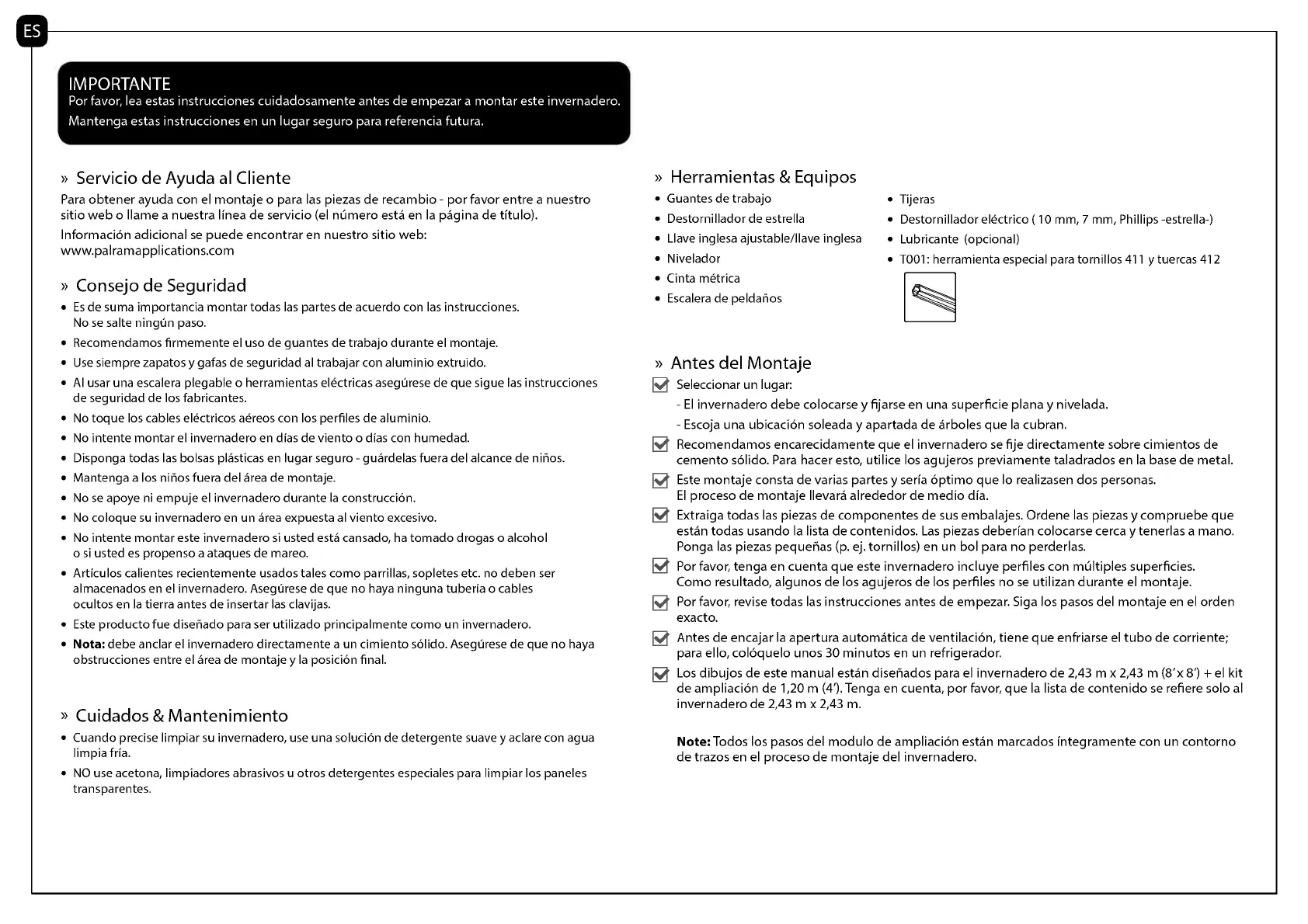 Por favor, lea estas instrucciones cuidadosamente antes de empezar a montar este invernadero.