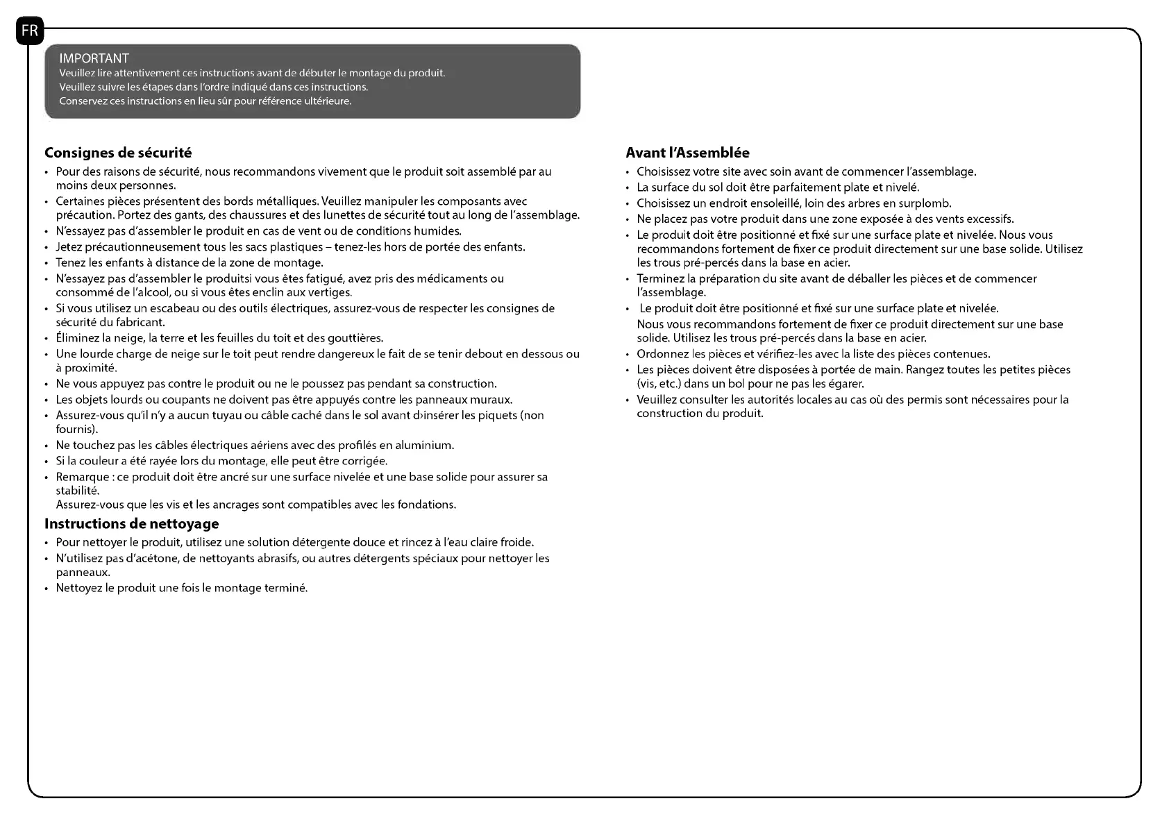 N'essayez pas d'assembler le produit en cas de vent ou de conditions humides.