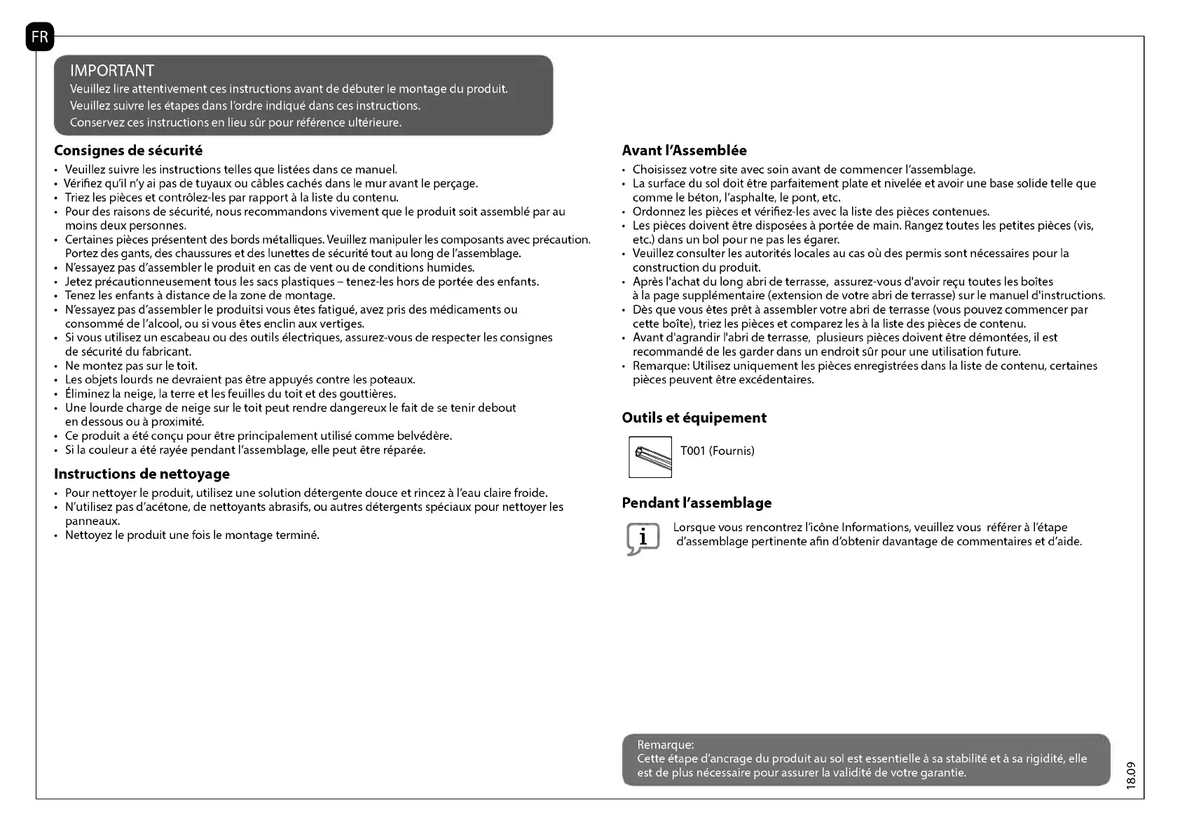 N'essayez pas d'assembler le produit en cas de vent ou de conditions humides.