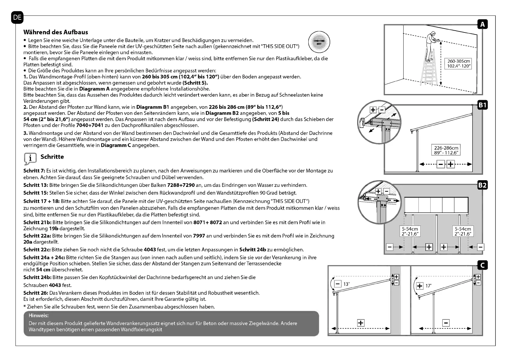 Bitte beachten Sie, dass Sie die Paneele mit der UV-geschutzten Seite nach auBen (gekennzeichnet mit"THIS SIDE OUT")