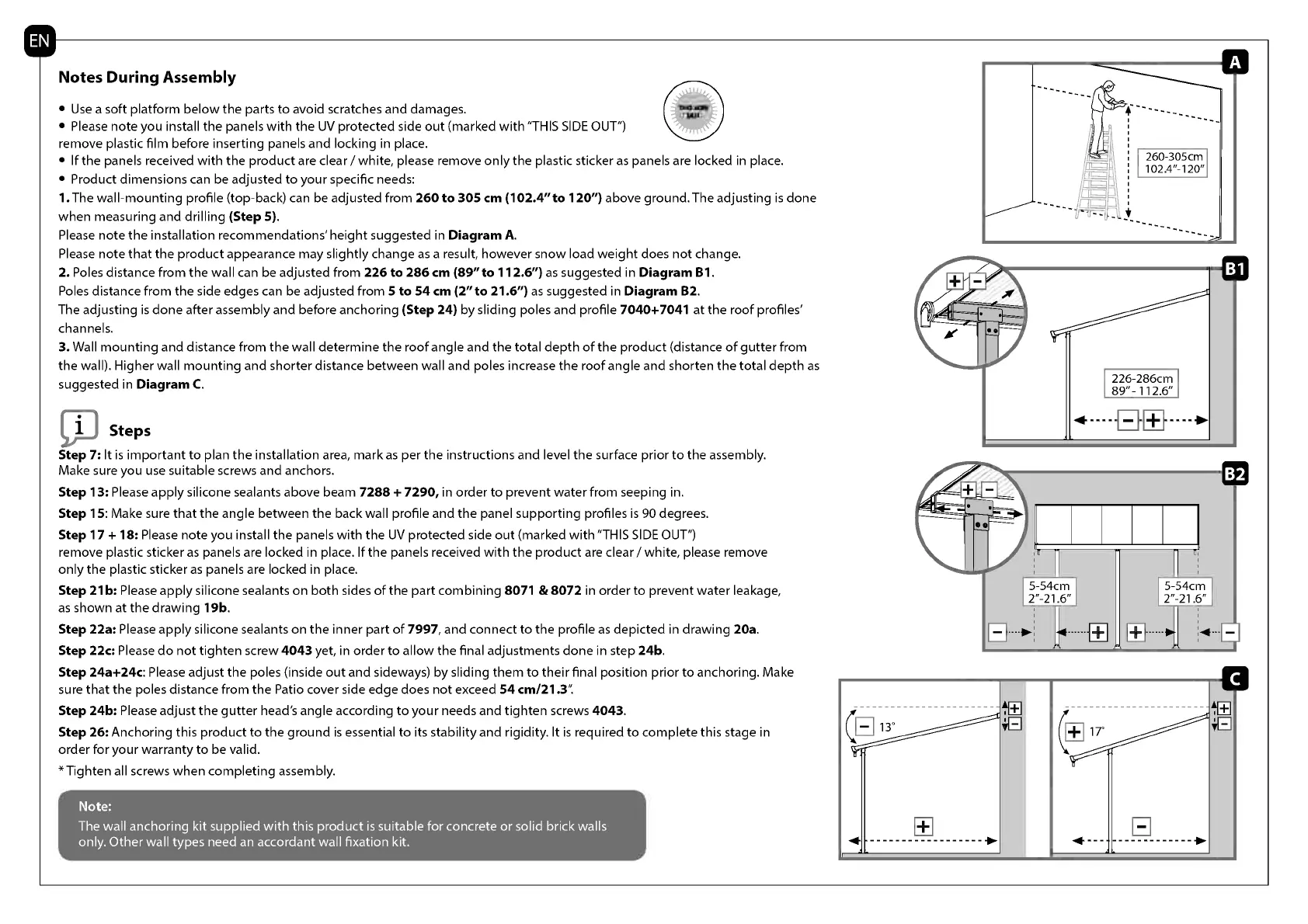 2. Poles distance from the wall can be adjusted from 226 to 286 cm (89" to 112.6") as suggested in Diagram B1.