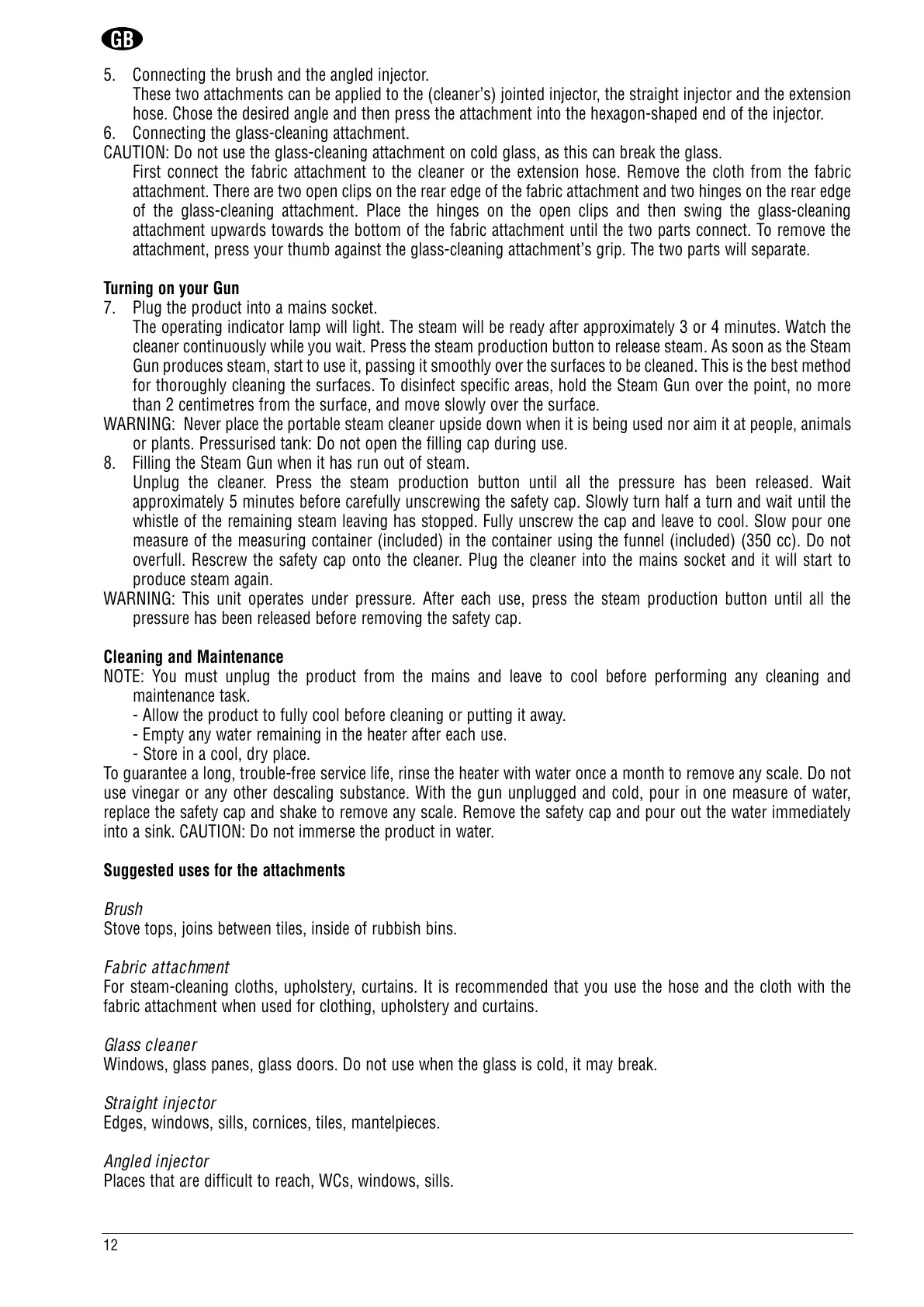 for thoroughly cleaning the surfaces. To disinfect specific areas, hold the Steam Gun over the point, no more