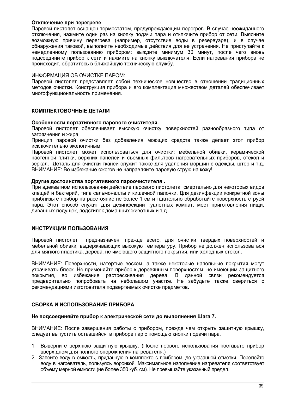 Паровой пистолет оснащен термостатом, предупреждающим перегрев. В случае неожиданного