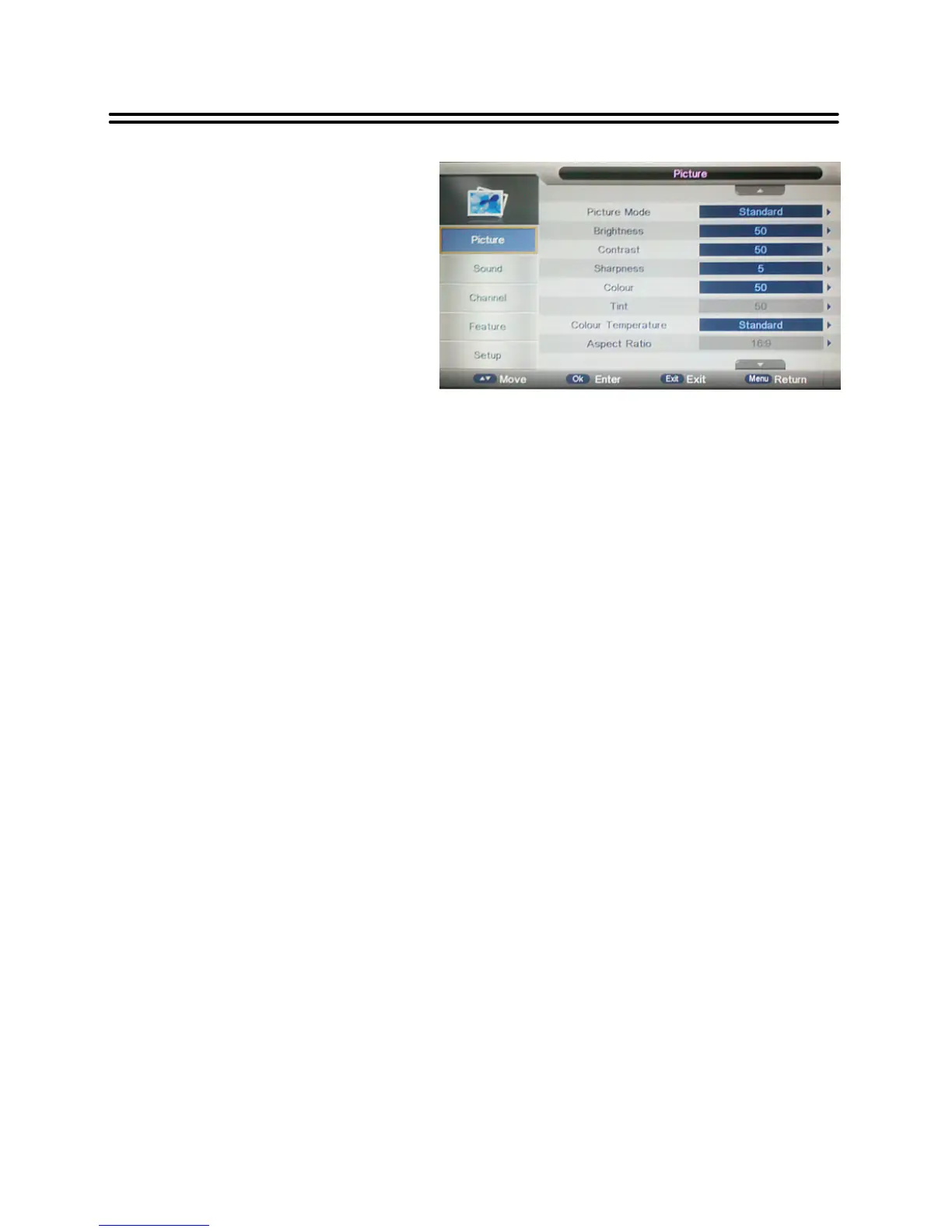 Press the ▲▼ button t o select Brightness/ Contrast/ Sharpness/ Colour/ Tin and press OK