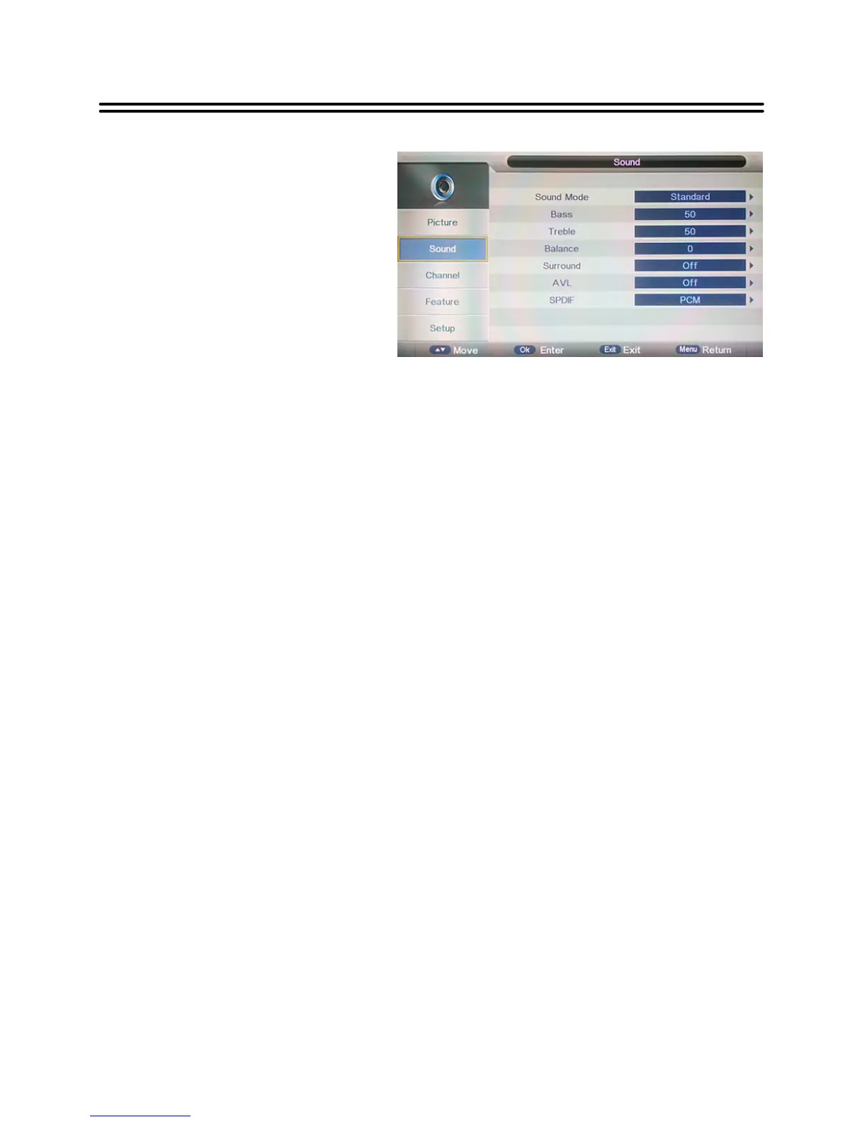 for Sound Mode, Bass, Treble, Balance,