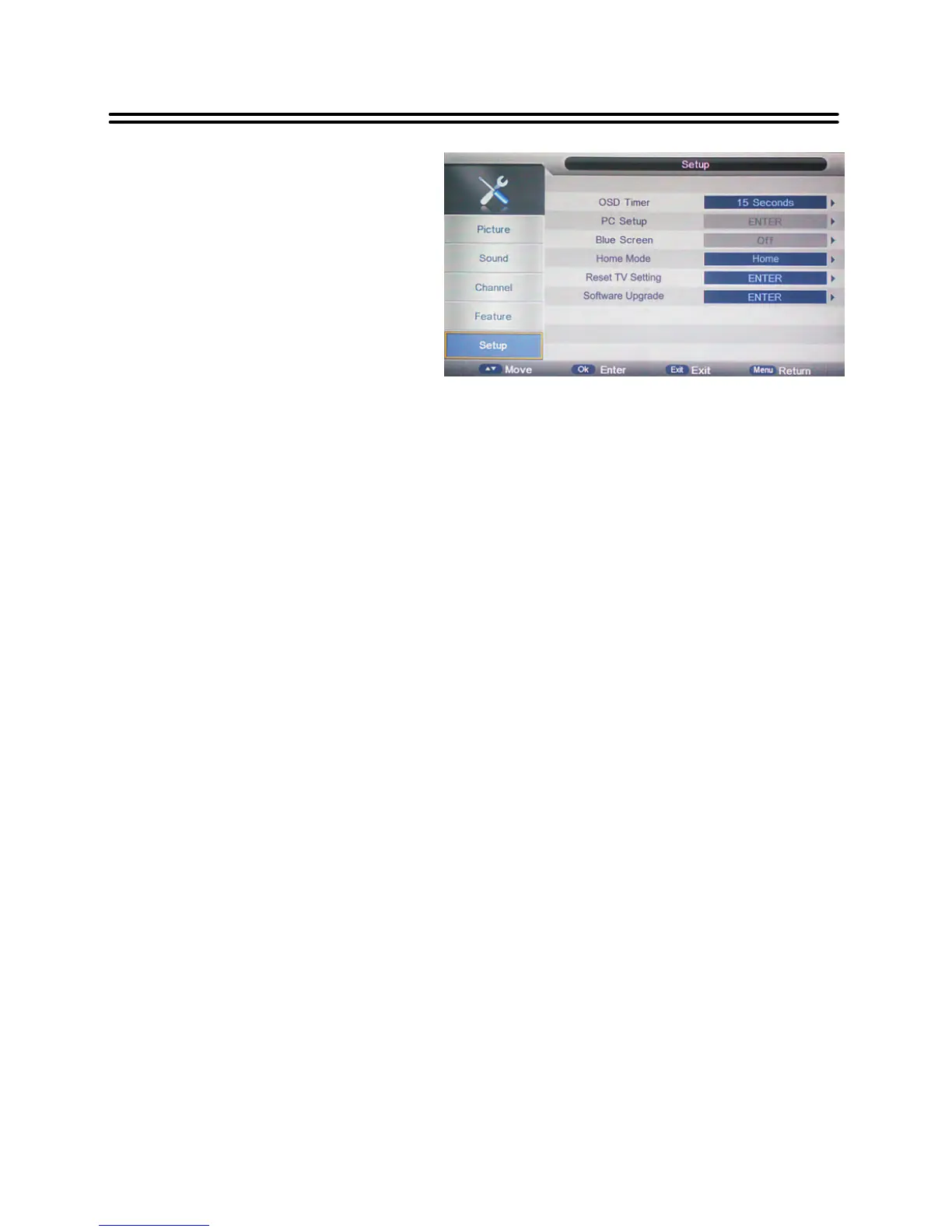 for OSD Timer, PC Setup, Blue Screen,