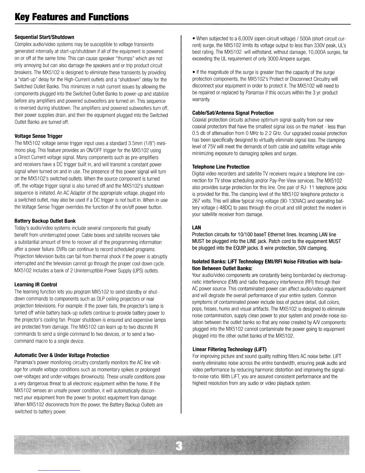 Panamax MX5102 - Key Features and Functions; Sequential Start;Shutdown; Battery Backup and Voltage Protection; Noise Filtration and Signal Protection