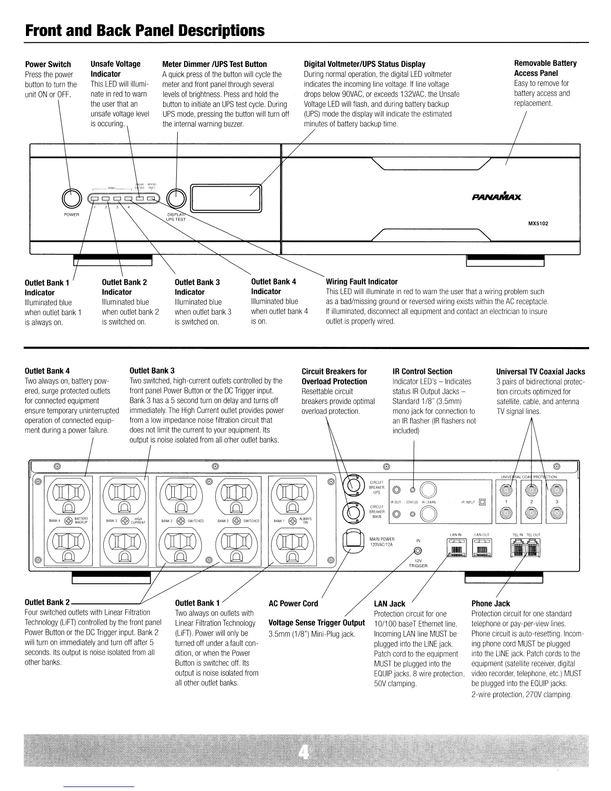 Panamax MX5102 - Front and Back Panel Descriptions; Front Panel Controls and Indicators; Rear Panel Outlets and Connections; Protection and Safety Features