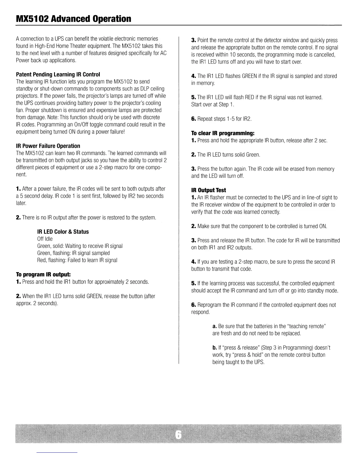 Panamax MX5102 - MX5102 Advanced Operation; Learning IR Control Features; IR Programming and Testing