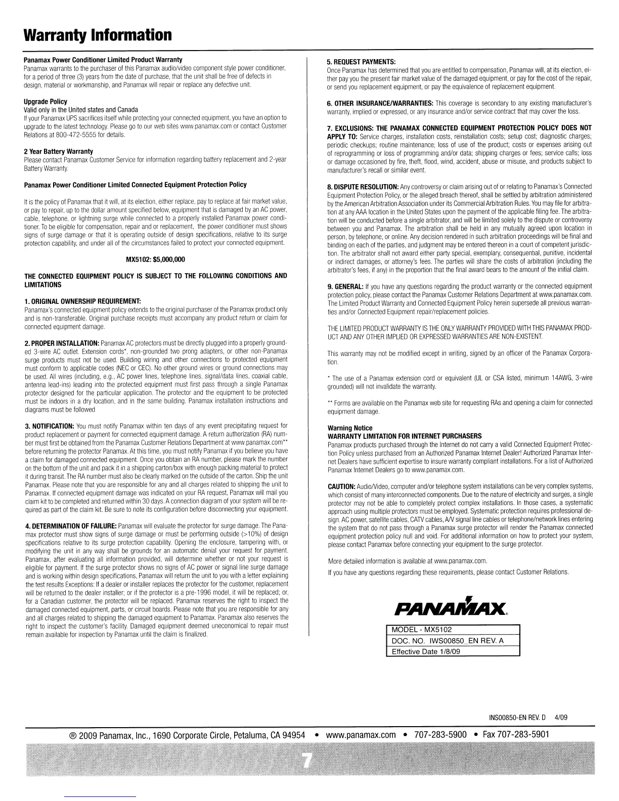 Panamax MX5102 - Warranty Information; Product and Battery Warranties; Connected Equipment Protection Policy; Upgrade Policy and Internet Purchaser Warning