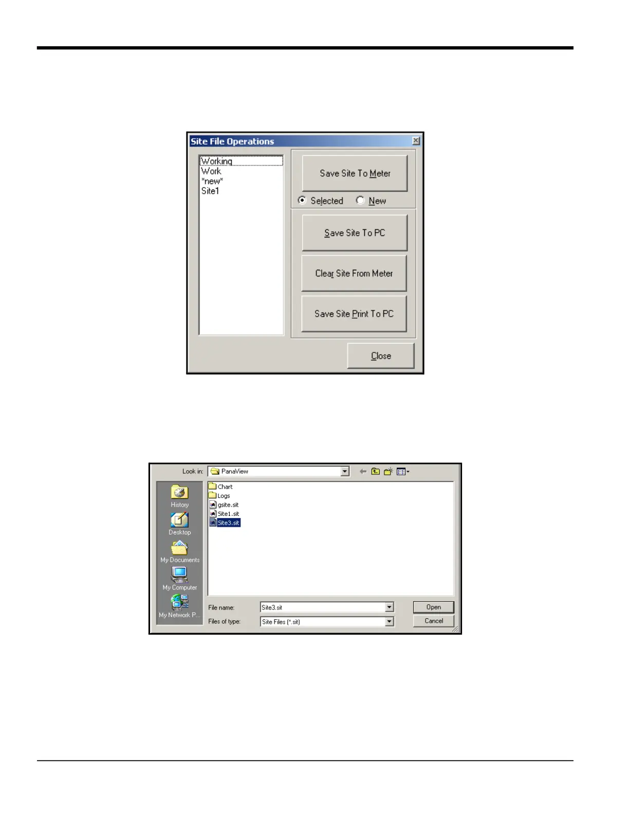 3. Highlight the desired site and click Open. PanaView sends the site to the meter.
