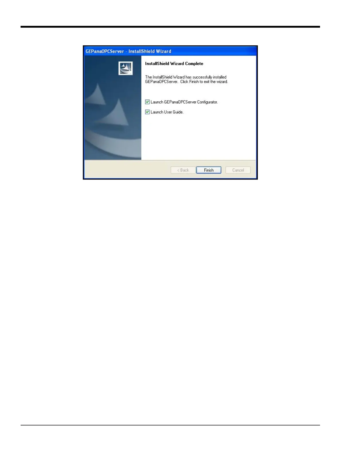 7. Click Finish to close the Wizard. You have installed GEPanaOPCServer.