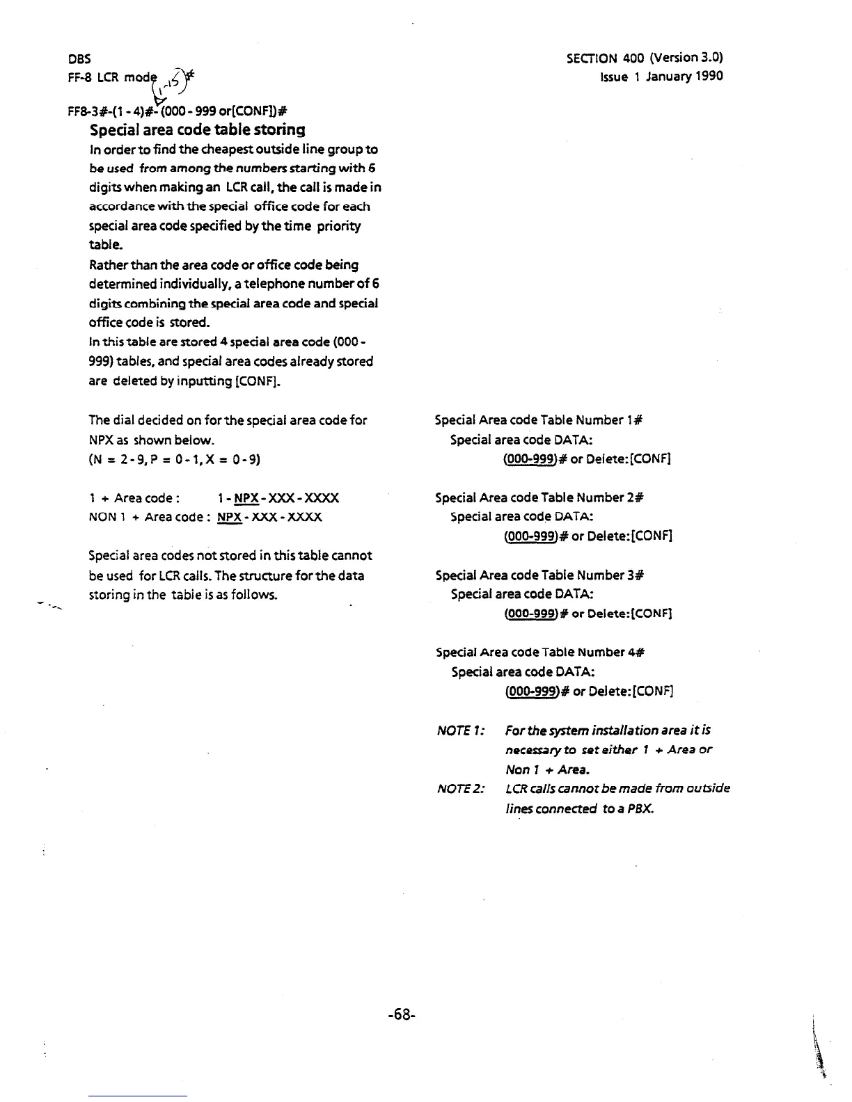 999) tables, and special area codes already stored