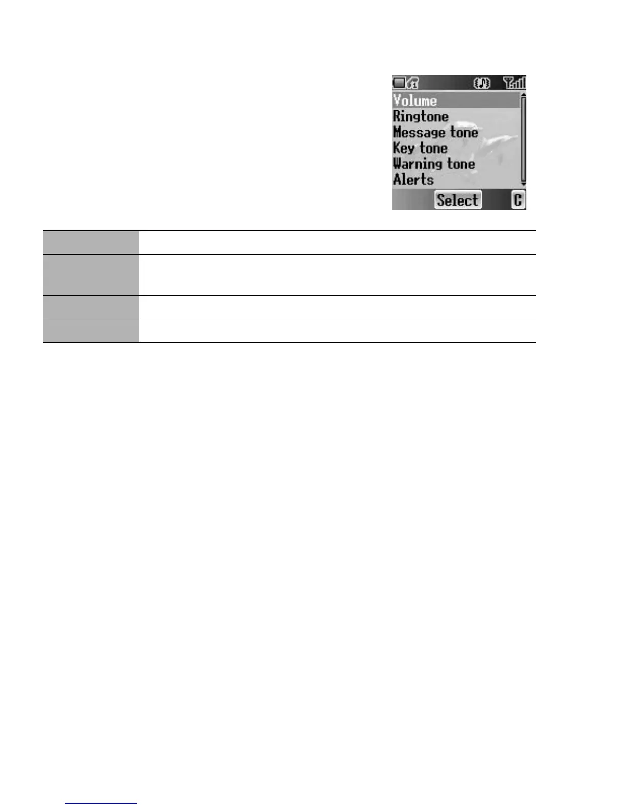 Message tone, Key tone, Warning tone and Alerts.