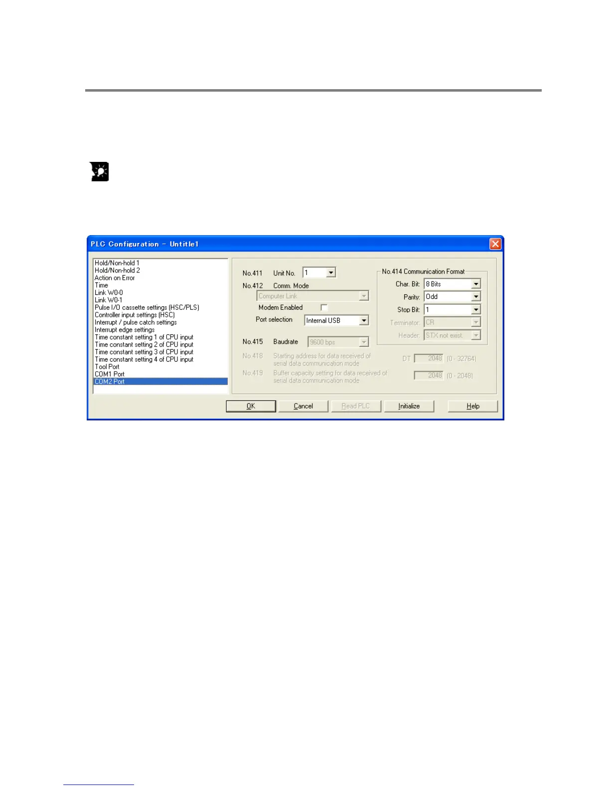 Select “Options” in the menu bar, and then select “PLC Configuration”. Click “COM2 Port”.