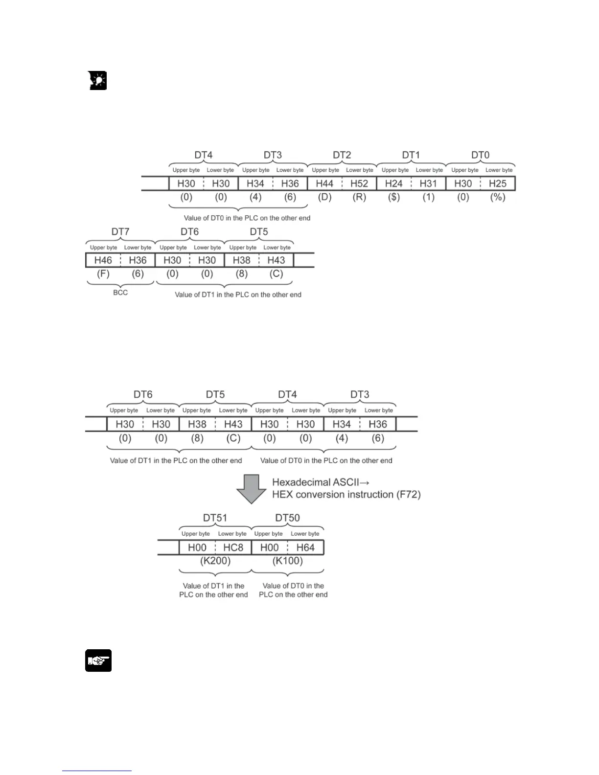 If K100 is stored in DT0 and K200 is stored in DT1 of the FP series PLC on the other end,