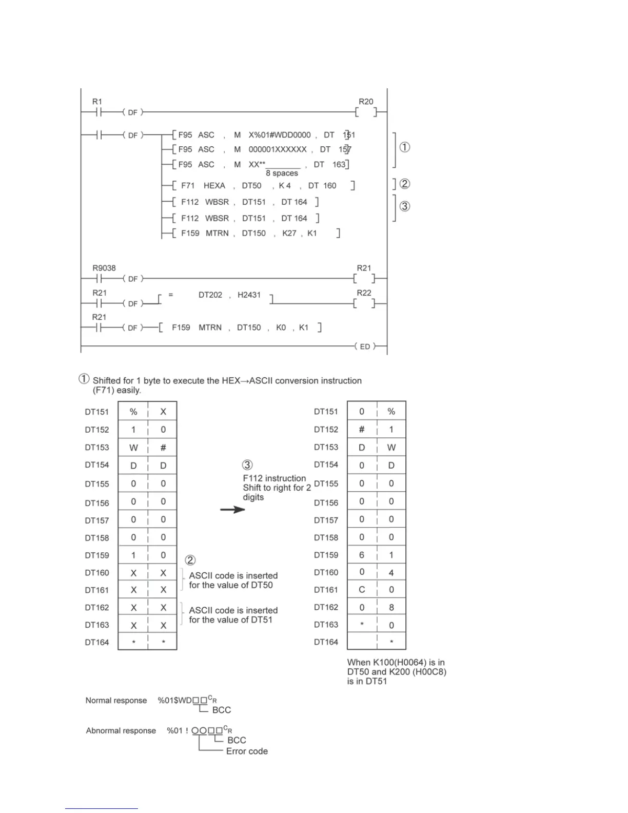 The values of DT50 and DT51 are written in DT0 and 1 of PLC.