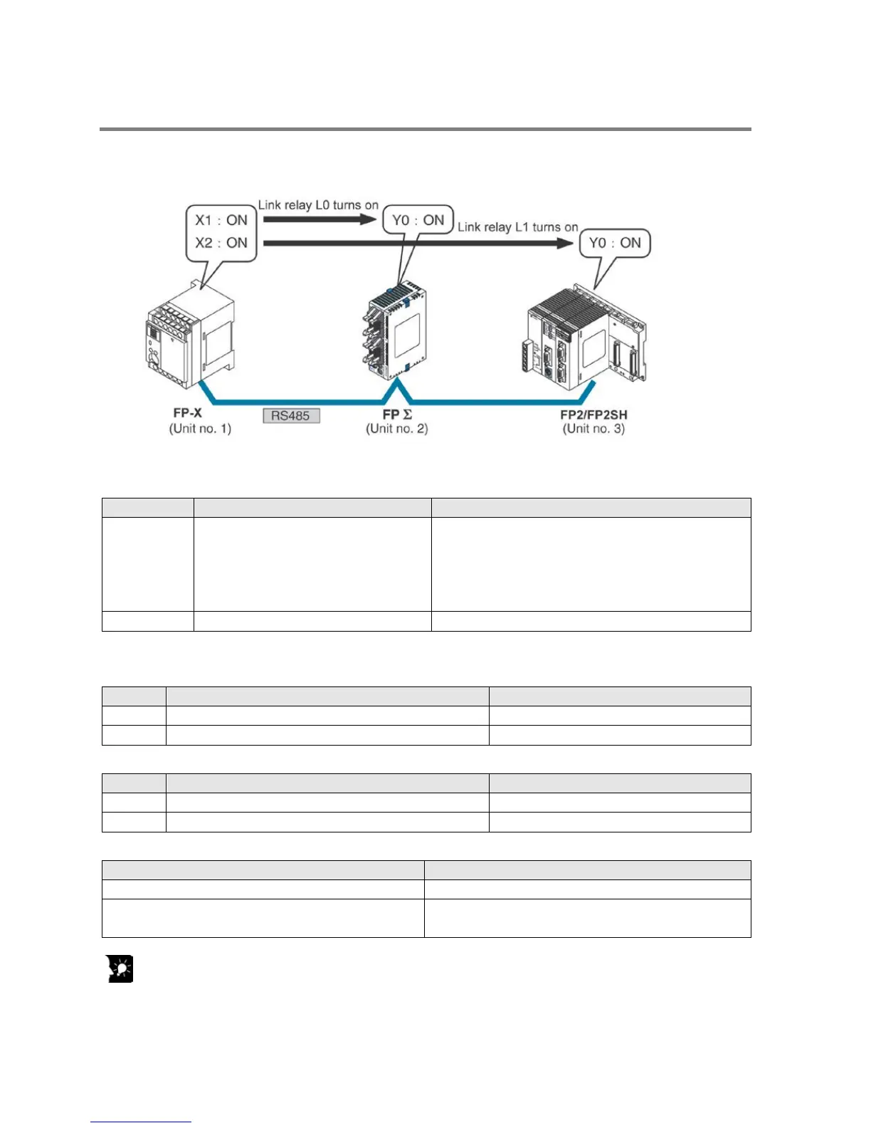 In the example shown here, link relays are use. When X1 of PLC with unit no. 1 turns on, Y0 of PLC with