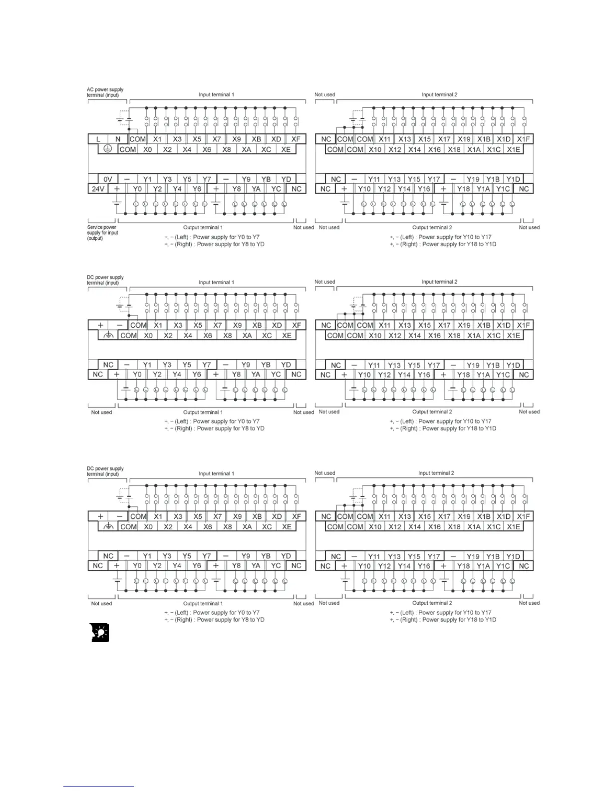 Each power supply terminal is separate. Use them in the range surrounded by the bold black lines.