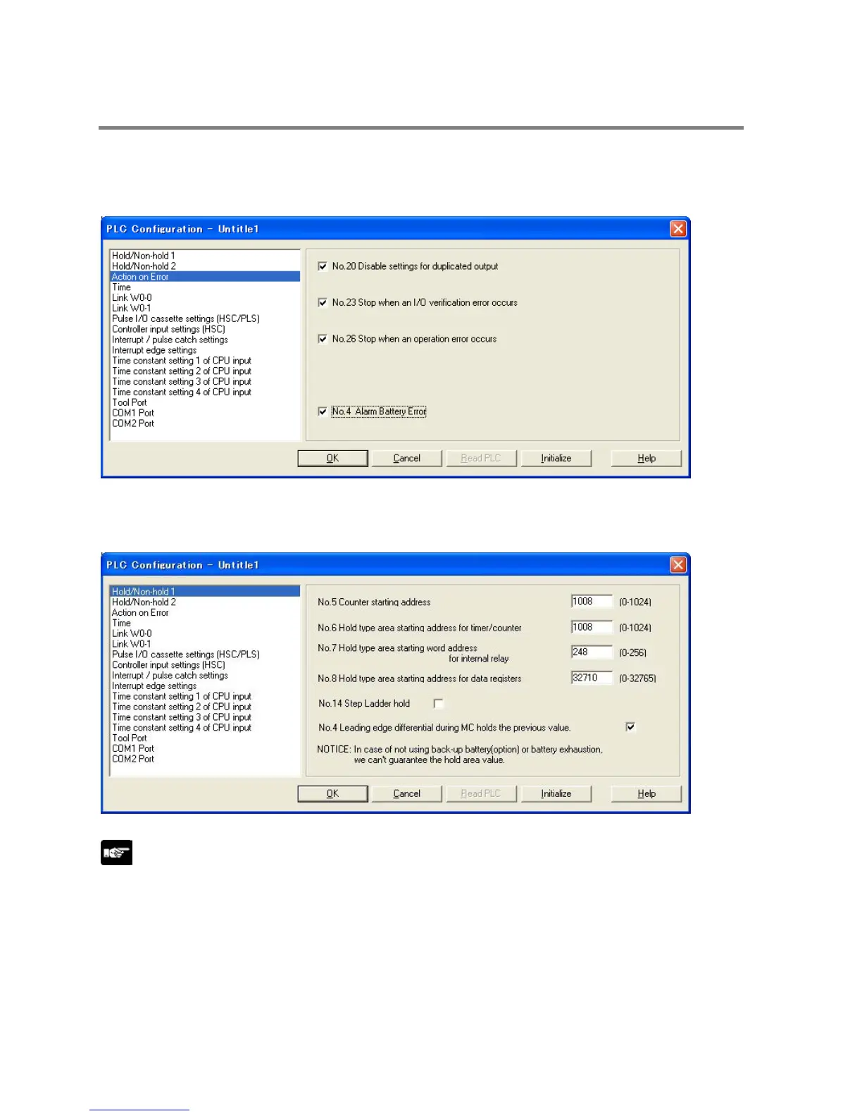 - The settings of the operation memory area such as data regiters and system registers No.6 to No.14