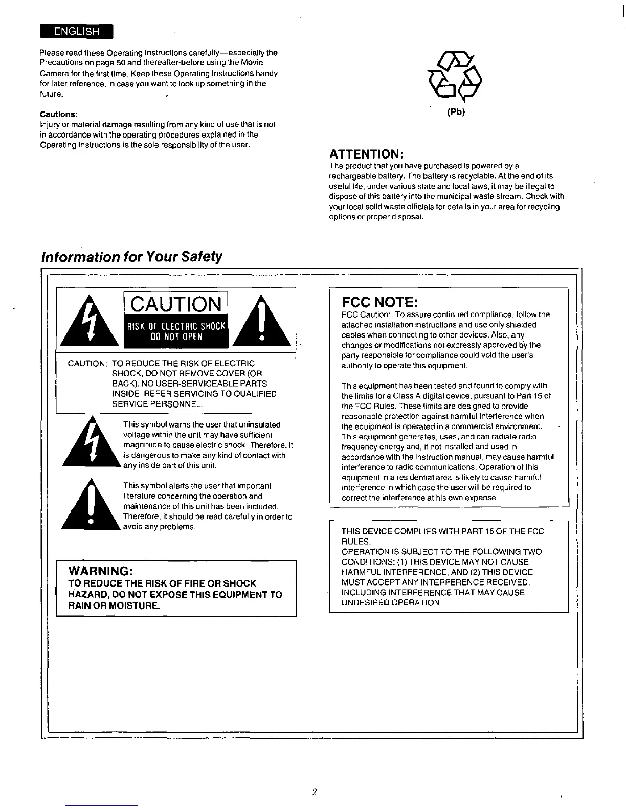 Panasonic AG-196UP - Information for Your Safety; General Safety Cautions