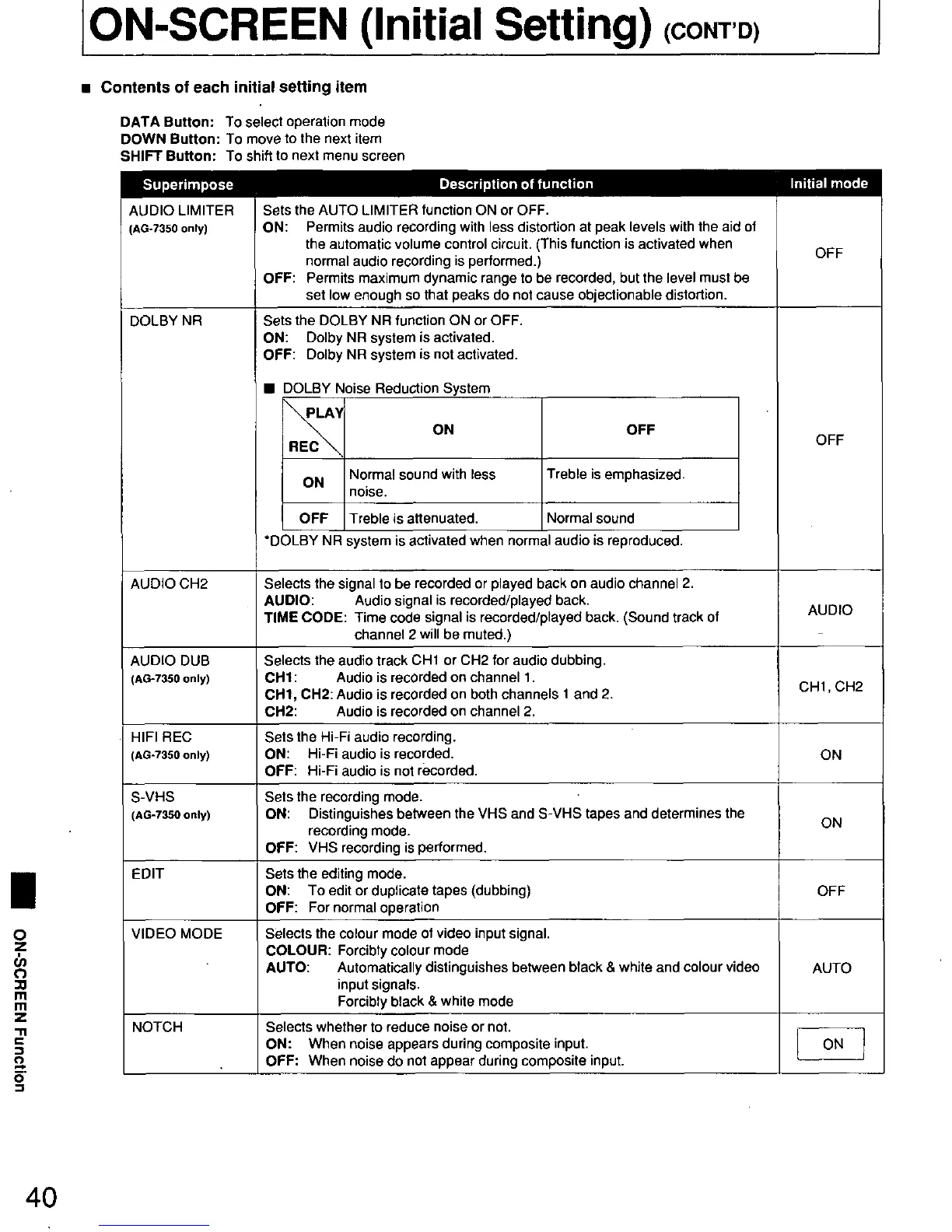 Panasonic AG-7150 - Contents of each Initial Setting Item