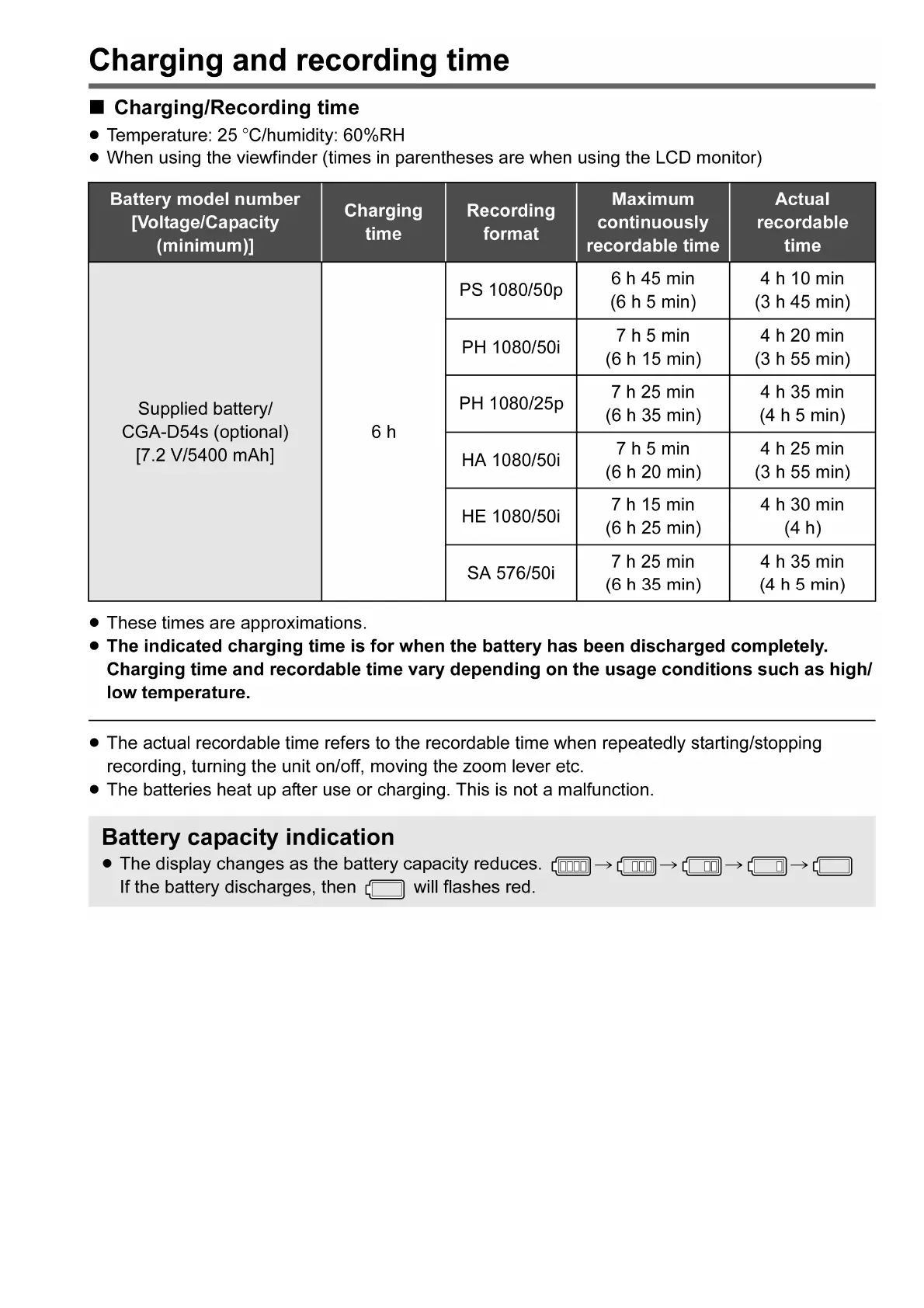 Panasonic AG-AC90MC - Model AG-AC90 EJ;EN Charging and Recording Time; Charging;Recording Time Details; Battery Capacity Indication