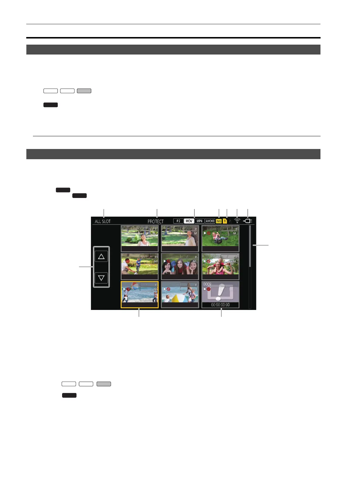 The clips in the recording file format (P2/MOV/MP4/AVCHD) selected in the [SYSTEM] menu → [FILE FORMAT] are displayed in the thumbnail screen.